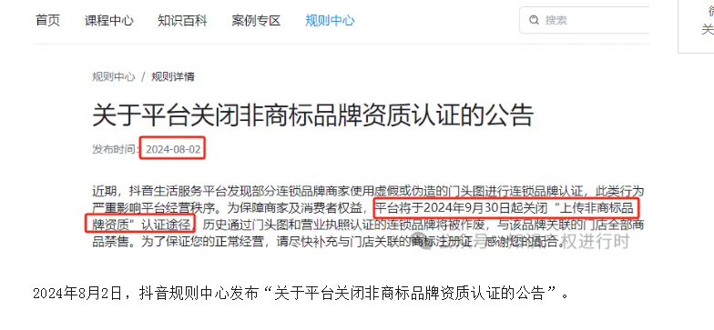 2024年8月2日,抖音规则中心发布“关于平台关闭非商标品牌资质认证的公告”。
